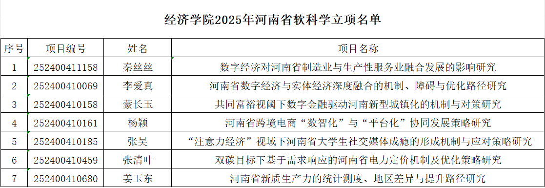 2025年3月20日,河南省科技厅下发了《关于下达河南省二○二五年科技发展计划的通知》,我院 7 位教师申请的软科学研究项目获批立项。其中,由秦丝丝博士主持的《数字经济对河南省制造业与生产性服务业融合发展的影响研究》项目获资金支持。